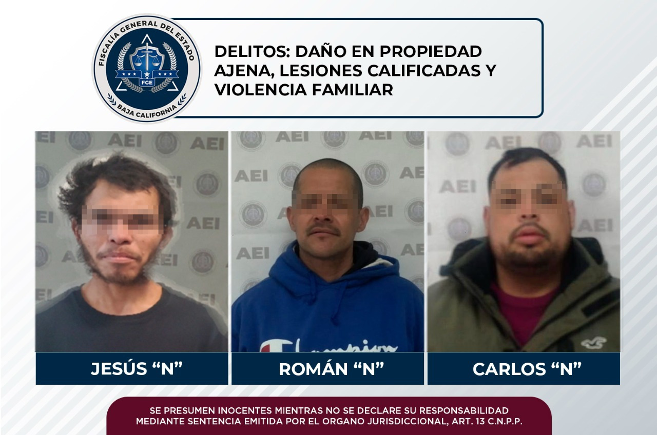 TECATE, B.C. Labores de investigación realizadas por agentes de la Fiscalía General de Baja California, dieron como resultado la cumplimentación de tres órdenes de aprehensión en contra de personas que eran requeridas por un Juez de Control por su probable responsabilidad en los delitos de daño en propiedad ajena, lesiones calificadas y violencia familiar.