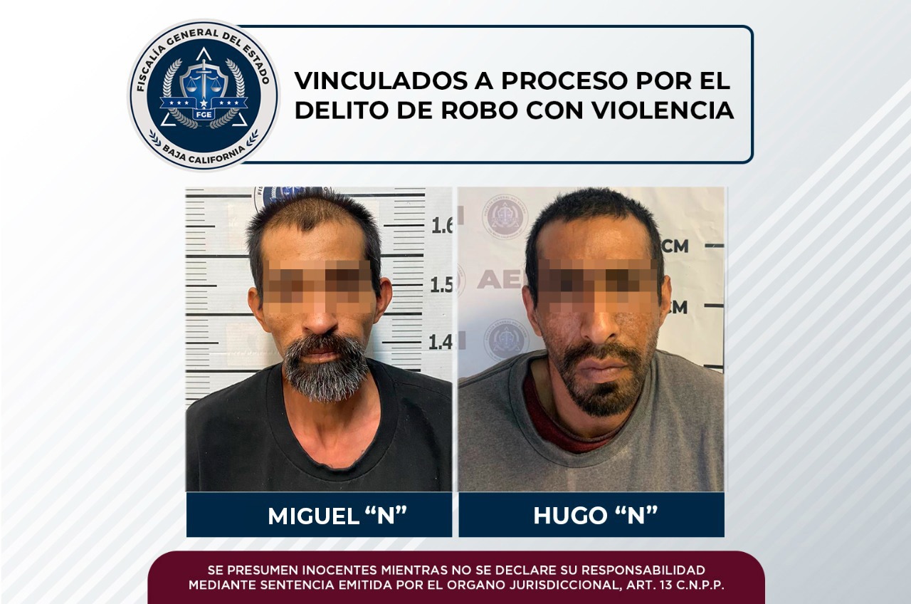 PLAYAS DE ROSARITO, B.C. Con base a elementos de prueba integrados en una carpeta de investigación por el delito de robo con violencia, la Fiscalía General del Estado, obtuvo la vinculación a proceso de Miguel “N” y Hugo “N,” ambos presuntamente relacionados en un mismo hecho que se registró en Playas de Rosarito, el 30 de diciembre del año pasado.