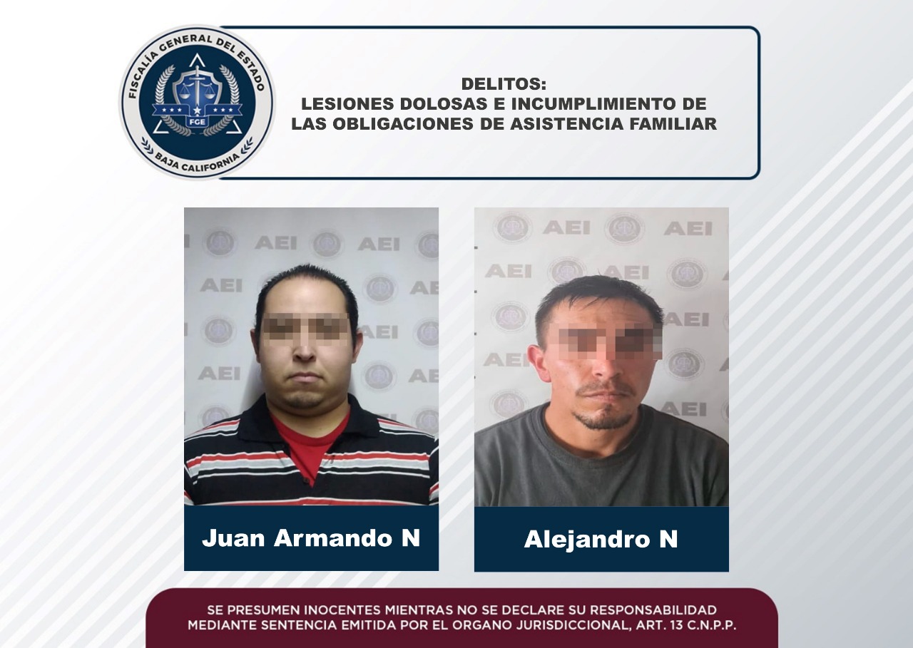 ENSENADA, B.C. 11 DE ENERO DE 2023.- La Fiscalía General del Estado cumplimentó, en acciones distintas, órdenes de aprehensión a dos sujetos por los delitos de lesiones dolosas e incumplimiento de las obligaciones de asistencia familiar.