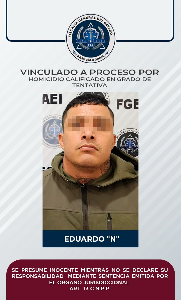 TIJUANA, B.C. Continuando con las tareas para salvaguardar la seguridad de las familias de Baja California y con el firme compromiso que los generadores de violencia enfrenten a la justicia, la Fiscalía General del Estado vinculó a proceso a Eduardo Antonio “N”, alias “El Cucho”, por el delito de homicidio calificado en grado de ejecución de tentativa.