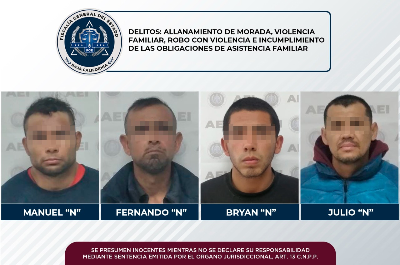 TECATE, B.C. Tras diversas acciones judiciales efectuadas por elementos de la Agencia Estatal de Investigación (AEI), se logró la captura de cuatro sujetos que contaban con orden de aprehensión vigente por diversos delitos, los cuales quedaron a disposición de la autoridad competente para que respondan por los ilícitos que se les imputan.