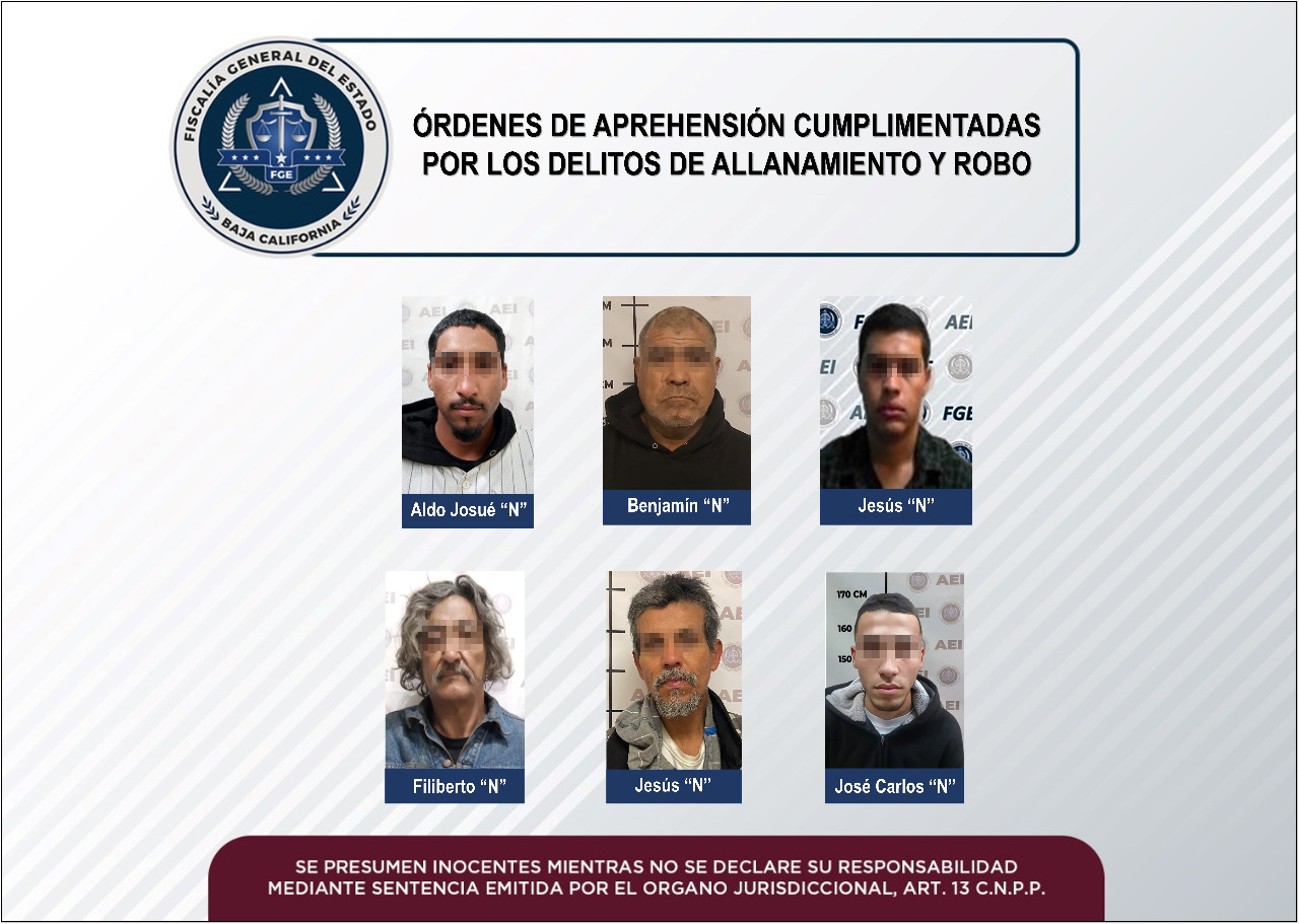 MEXICALI, B.C. Dando seguimiento a las carpetas de investigación, elementos de la Agencia Estatal de Investigación (AEI) adscritos a la Fiscalía Regional de Mexicali lograron el aseguramiento de seis sujetos prófugos de la justicia por diferentes delitos.