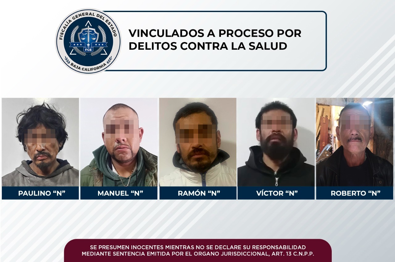 TIJUANA, B.C. La Fiscalía General del Estado informa que, cinco imputados por delitos contra la salud en la modalidad de narcomenudeo, fueron vinculados a proceso penal, luego de que los elementos de prueba presentados por el Ministerio Público fueron suficientes para que los jueces de control determinaran iniciar procesos en su contra.