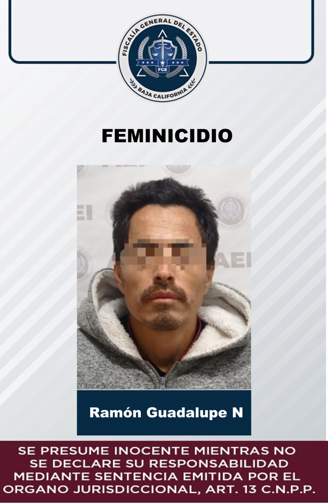 Como resultado de acciones de investigación, elementos de la Fiscalía General de Baja California, en Ensenada, capturaron a Ramón Guadalupe “N”, de 44 años de edad, para que sea conducido a proceso por el crimen cometido en agravio de Carmen “N”, con quien sostenía una relación sentimental.