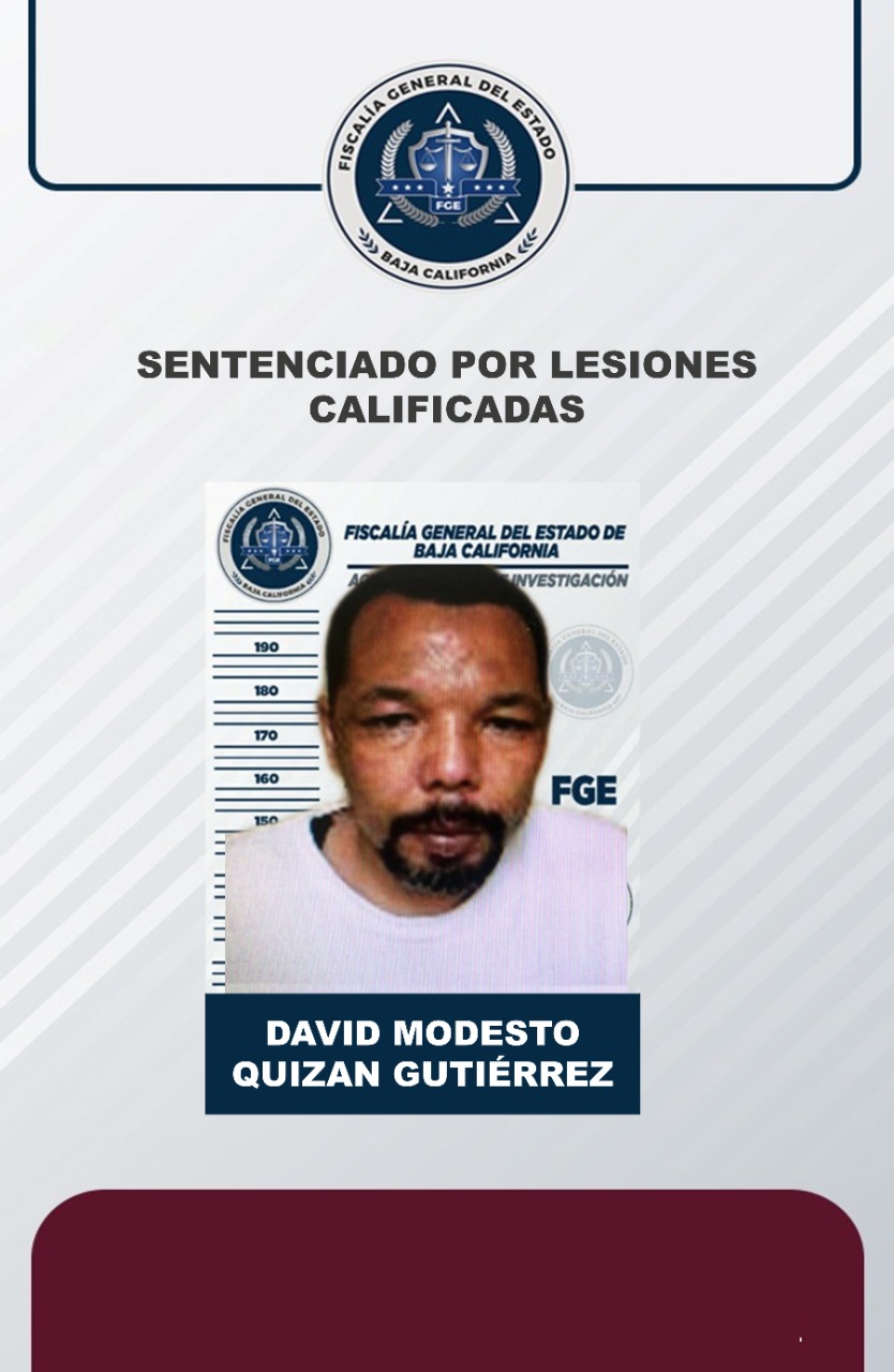 MEXICALI, B.C. La Fiscalía General del Estado, a través del trabajo realizado por la Fiscalía Especializada en Delitos Contra la Vida, con base en la integración de la carpeta de investigación, logró una sentencia condenatoria en contra de David Modesto Quizan Gutiérrez, alias “El Cory”, por el delito de lesiones calificadas.