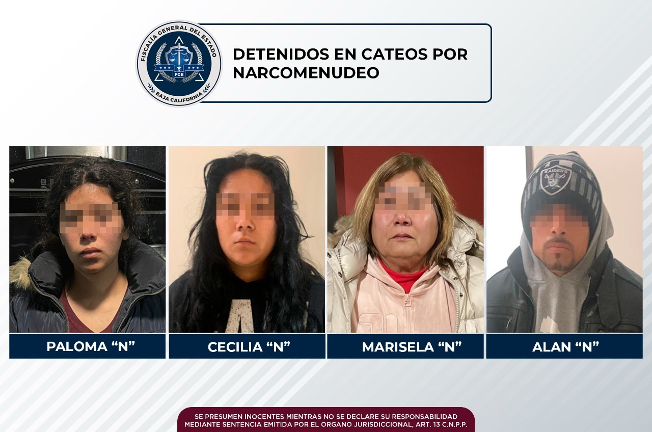 TIJUANA, B.C. Como resultado de la estrategia implementada por la Fiscalía General del Estado para ubicar puntos de compra - venta de droga, durante tres cateos realizados en colonias de Tijuana y Playas de Rosarito, se detuvo a cuatro personas y se decomisaron diversas cantidades de enervantes.