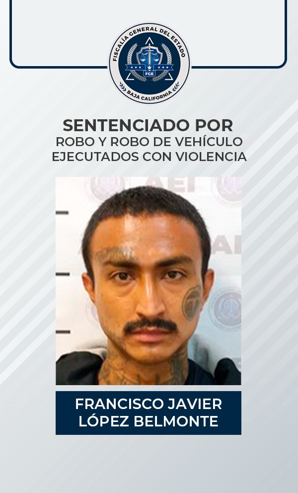 TIJUANA, B.C. La Fiscalía Regional de Tijuana, por medio de un procedimiento abreviado, logró que Francisco Javier López Belmonte fuera sentenciado a 6 años y 4 meses de prisión por resultar penalmente responsable de los delitos de robo y robo de vehículo ejecutados con violencia.