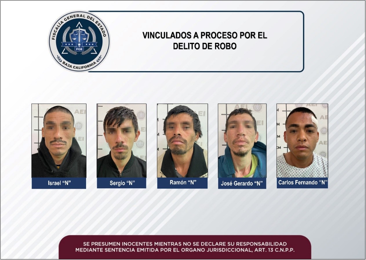 MEXICALI, B.C. La Fiscalía Regional de Mexicali logró, en audiencias por separado, la vinculación a proceso penal de cinco hombres acusados por el delito de robo en sus diferentes modalidades.