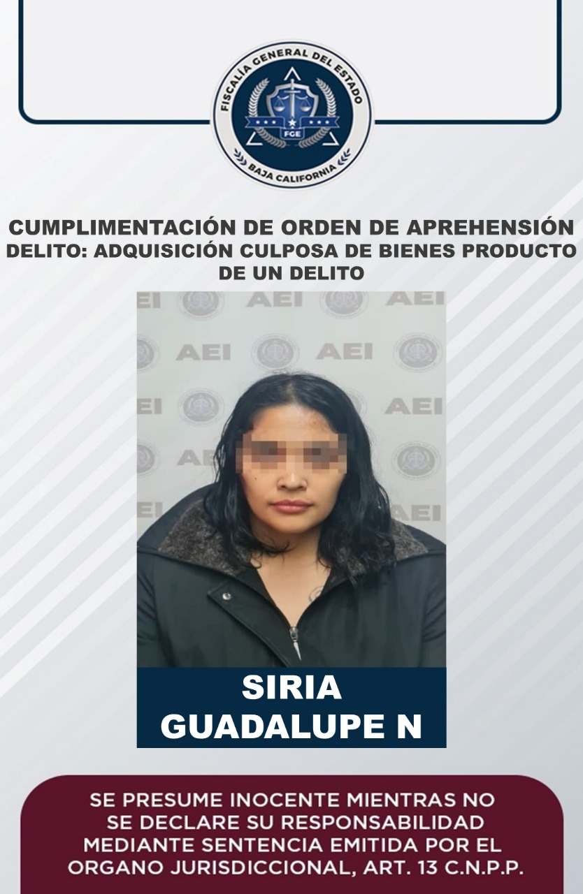 ENSENADA, B.C. Agentes de la Fiscalía General del Estado (FGE), cumplimentaron orden de aprehensión contra una mujer, por el delito de adquisición culposa de bienes producto de un delito.