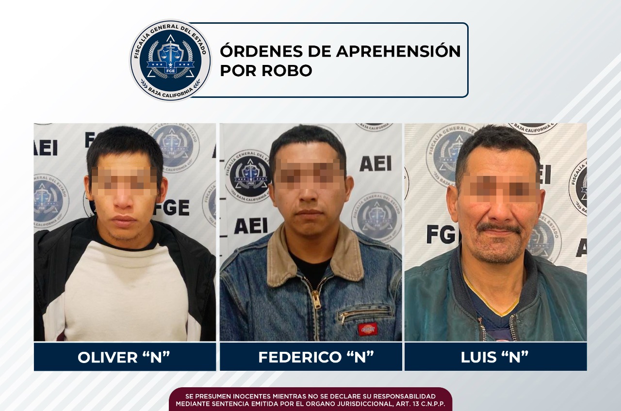 TIJUANA, B.C. Por robo en diversas modalidades, agentes de la Fiscalía General del Estado cumplimentaron tres órdenes de aprehensión a igual número de personas, quienes presuntamente están relacionadas en dichos ilícitos, en casos por separado.