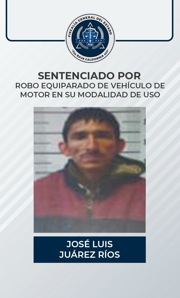 PLAYAS DE ROSARITO, B.C. Con base a los medios de prueba expuestos por la Fiscalía Regional de Playas de Rosarito, se obtuvo una sentencia condenatoria para José Luis Juárez Ríos, quien aceptó su responsabilidad en el delito de robo equiparado de vehículo de motor en su modalidad de uso.