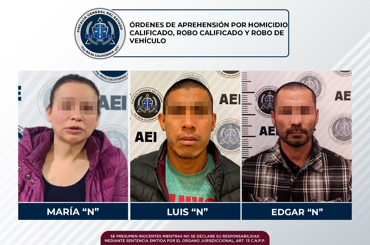 TIJUANA, B.C. Acciones de gabinete y campo desarrolladas por agentes de la Fiscalía General del Estado, derivaron en la cumplimentación de órdenes de aprehensión, en contra de dos hombres y una mujer, quienes están relacionados, en casos distintos, en los delitos de homicidio calificado, robo calificado y robo de vehículo.