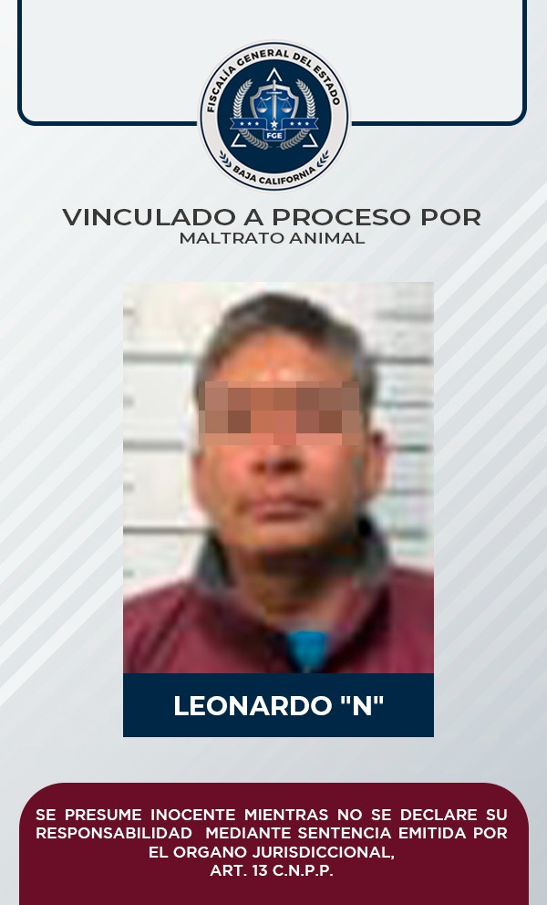 PLAYAS DE ROSARITO, B.C. Como resultado de actos de investigación y diligencias desarrolladas por la Fiscalía Regional de Playas de Rosarito, fue posible obtener la vinculación a proceso de Leonardo “N”, acusado del delito de maltrato animal.