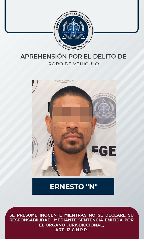PLAYAS DE ROSARITO, B.C. Por estar presuntamente relacionado en el delito de robo equiparado de vehículo de motor, a un individuo le fue cumplimentada una orden de aprehensión por parte de agentes de la Fiscalía General del Estado, tras hechos ocurridos en 2021 en Playas de Rosarito.