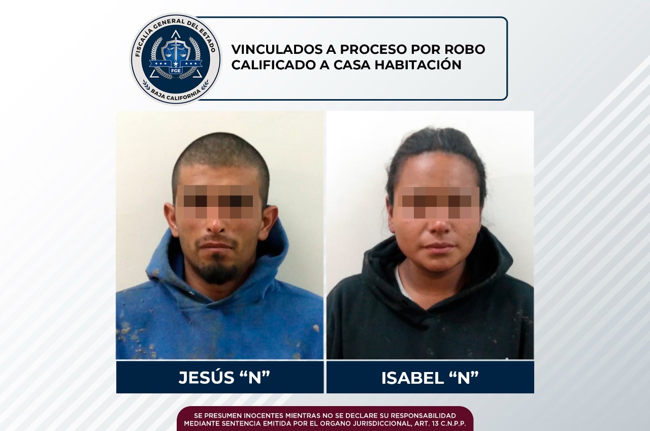 TIJUANA, B.C. Mediante datos de prueba concluyentes aportados por el Ministerio Público ante un Juez de Control, fue posible la vinculación a proceso de un hombre y una mujer, acusados del delito de robo calificado a casa habitación cometido el pasado 20 de enero en una vivienda de la colonia Corona del Mar.