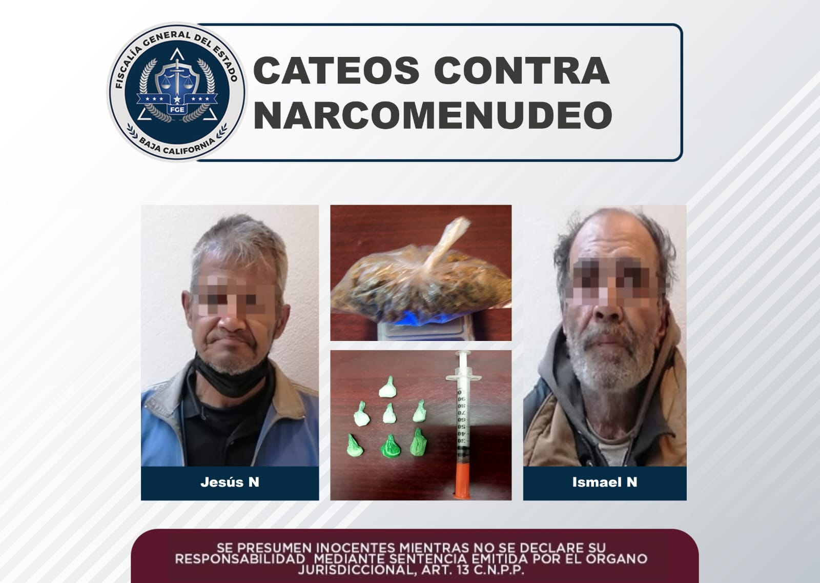 Durante la primera diligencia quedaron bajo arresto Ismael “N” y Jesús “N”, por estar presuntamente involucrados en la comisión de delitos contra la salud, puesto que se encontraban dentro del domicilio donde se decomisaron 7 envoltorios con cristal y una jeringa con heroína; en colonia Reforma.
