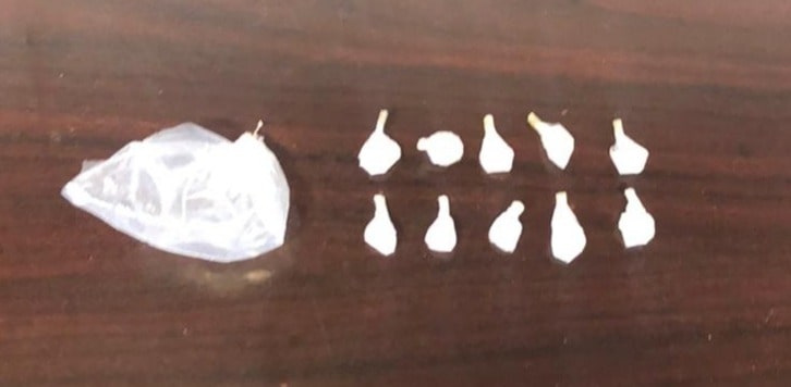 Al momento, se procedió a realizar la revisión precautoria, encontrándole entre sus pertenencias 10 dosis de una sustancia granulada con las características similares a la metanfetamina.