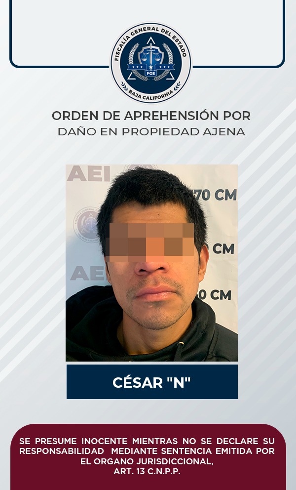 PLAYAS DE ROSARITO, B.C. Por el delito de daño en propiedad ajena, agentes de la Fiscalía General del Estado, cumplimentaron una orden de aprehensión a César “N”, acusado del ilícito en mención, en hechos ocurridos en agosto de 2022, en Playas de Rosarito.