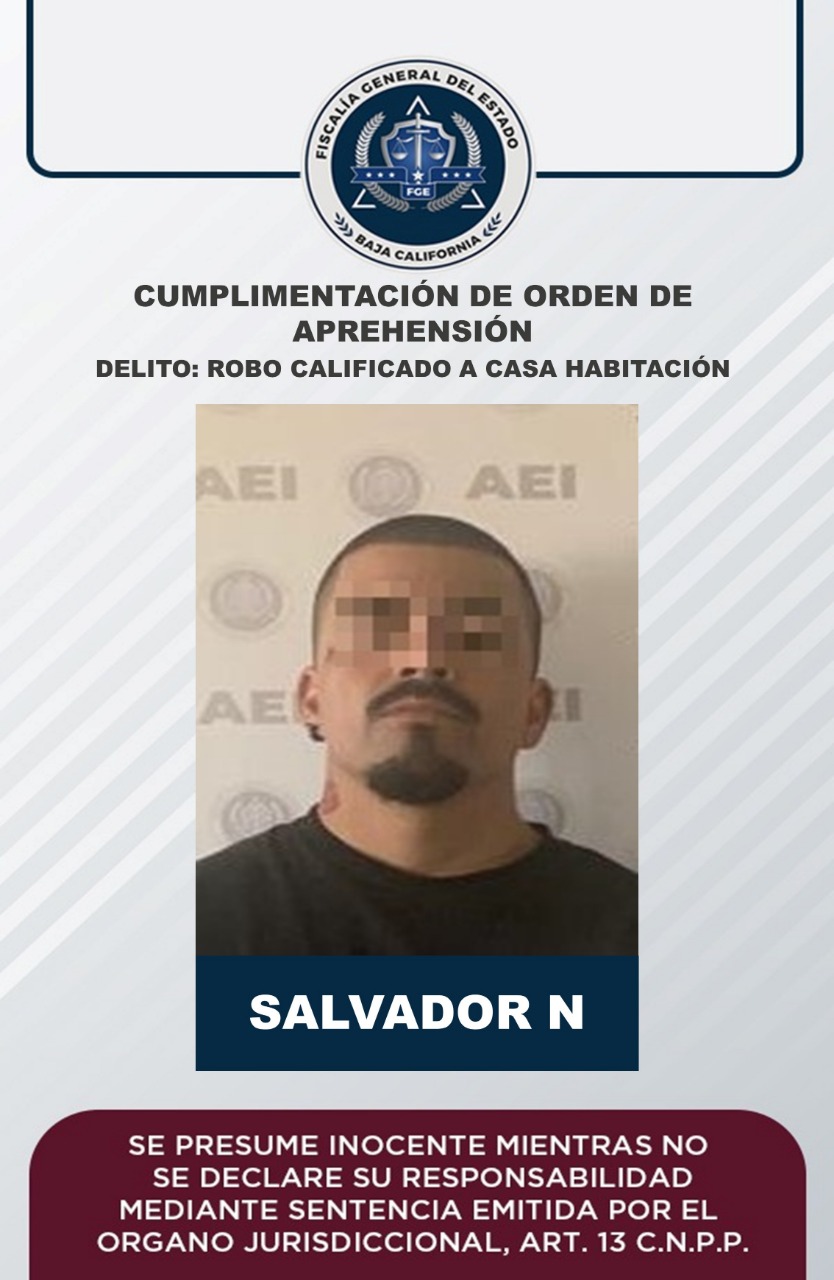 ENSENADA, B.C. Por su presunta participación en el robo sucedido en un domicilio de la colonia Lomitas, agentes de la Fiscalía General del Estado (FGE), cumplimentaron la orden de aprehensión contra Salvador “N” de 31 años de edad.