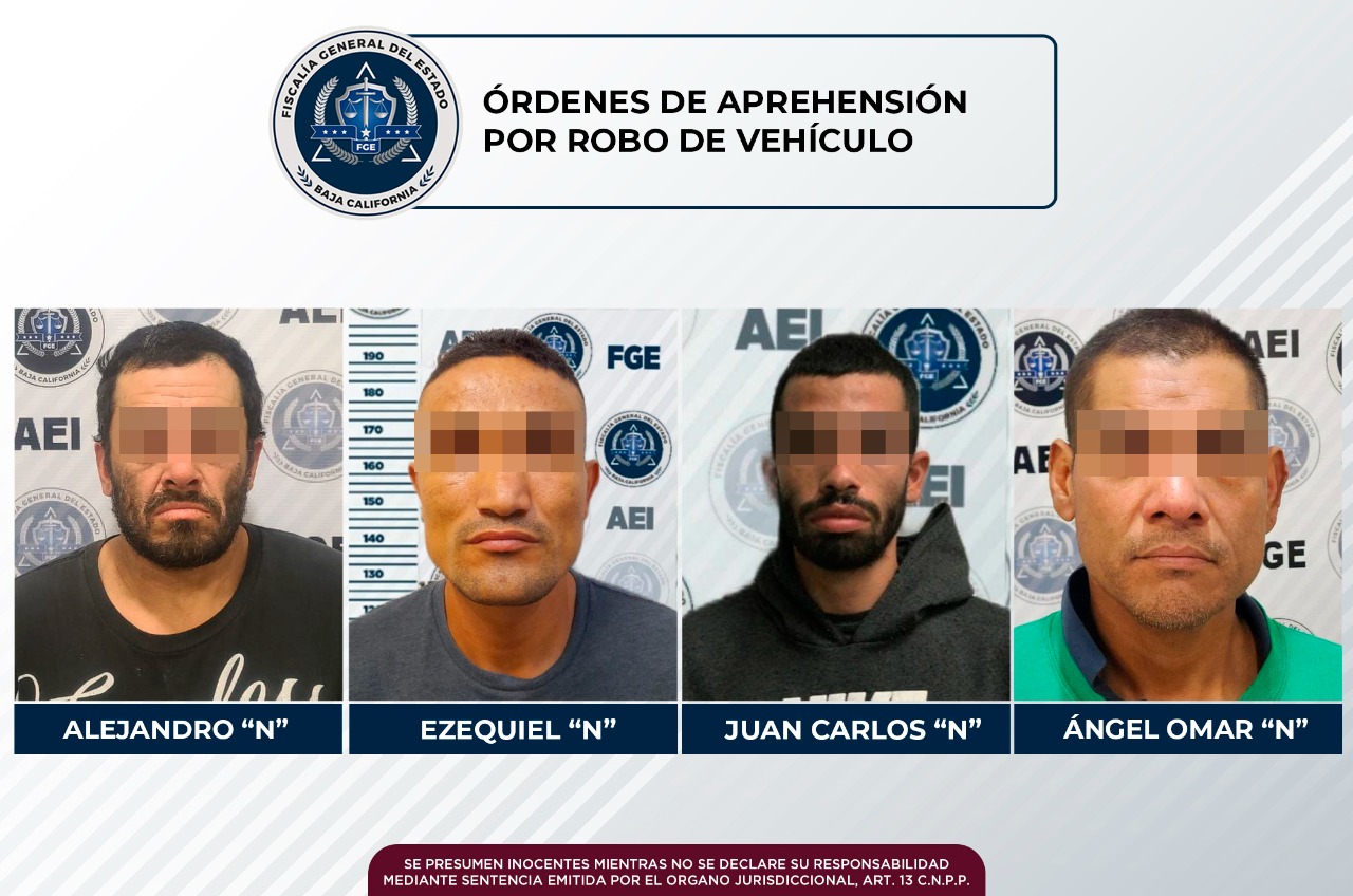 TIJUANA, B.C. Por la presunta comisión en el delito de robo de vehículo, cuatro sujetos fueron ubicados y aprehendidos, en hechos distintos, por elementos de la Agencia Estatal de Investigación (AEI) de la Fiscalía General del Estado (FGE), por lo que deberán responder ante la autoridad competente por los señalamientos que existen en su contra.