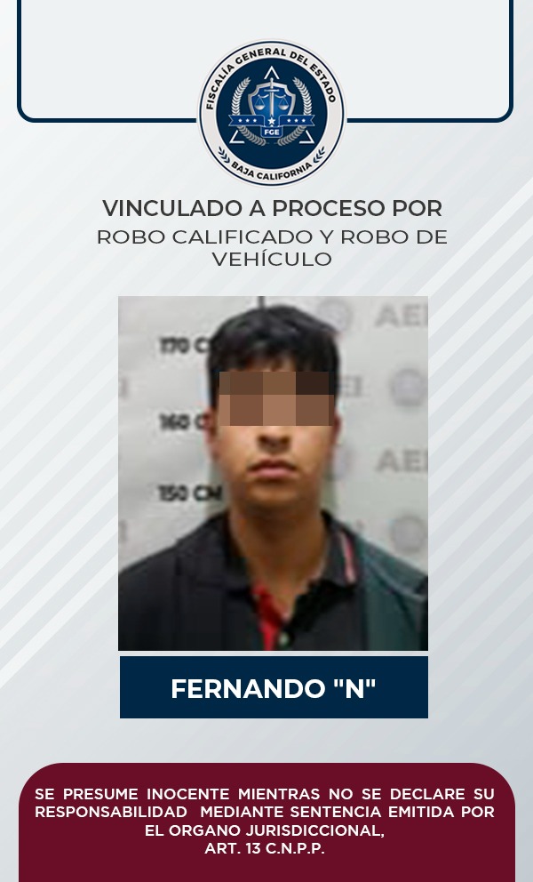 TIJUANA, B.C. Producto de una investigación desarrollada por la Fiscalía Regional de Tijuana, fue posible presentar ante la autoridad juzgadora al de nombre Fernando “N”, quien quedó vinculado a proceso y en prisión preventiva por los delitos de robo calificado y robo de vehículo de motor, ambos ilícitos ejecutados con violencia.