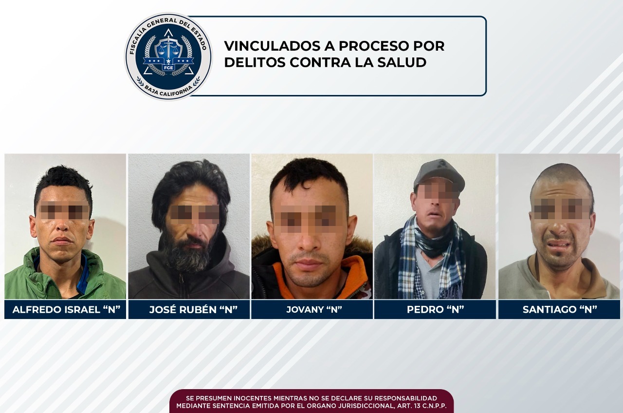 TIJUANA, B.C. La Fiscalía General del Estado informa que fueron vinculados a proceso penal cinco imputados por delitos contra la salud, en asuntos diversos, además permanecerán con la medida cautelar de prisión preventiva.