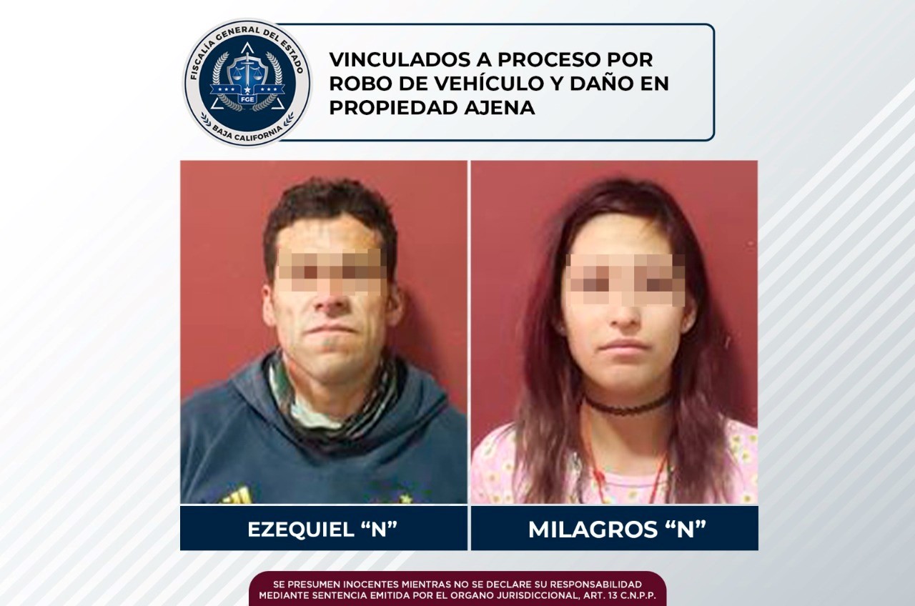 TIJUANA, B.C. La Fiscalía General del Estado informa que, derivado del trabajo del Ministerio Público en audiencia de vinculación, quedaron sujetos a proceso dos presuntos implicados, hombre y mujer, por los delitos de robo equiparado de vehículo en su modalidad de uso y daño en propiedad ajena culposo.