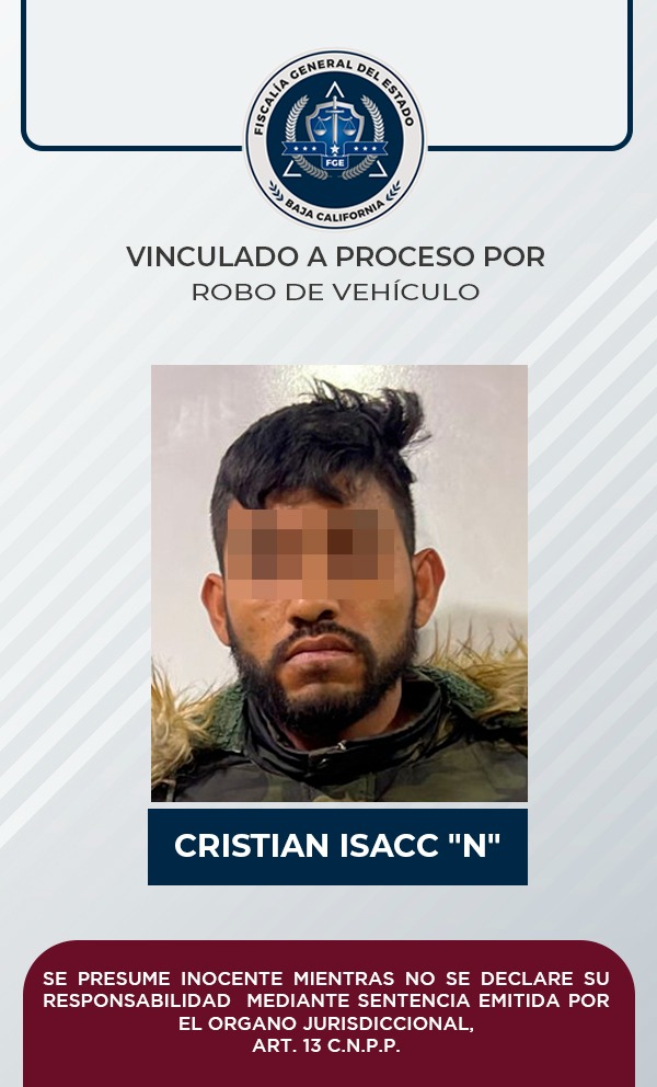 TIJUANA, B.C. Tras escuchar los argumentos lógicos y jurídicos por parte del agente del Ministerio Público de la Fiscalía Regional de Tijuana, el Juez de Control dictó auto de vinculación a proceso en contra de Cristian Isacc “N”, por ser probable responsable del delito de robo equiparado de vehículo de motor en la modalidad de poseer.