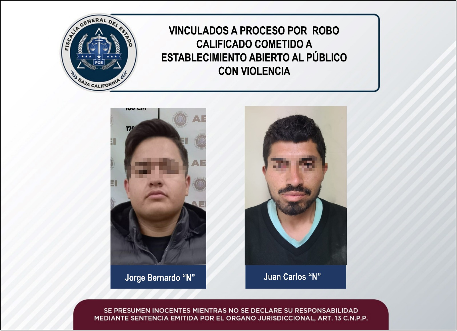 MEXICALI, B.C. La Fiscalía Regional de Mexicali, logró la vinculación a proceso en contra de dos imputados por los delitos de robo calificado cometido a un establecimiento comercial abierto al público con violencia, mediante audiencias por separado.
