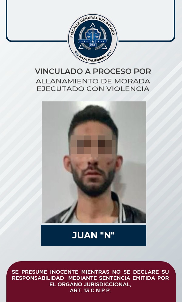 TIJUANA, B.C. Tras los datos de prueba presentados por el agente del Ministerio Público de la Fiscalía Regional de Tijuana, ante un Juez de Control, se obtuvo la vinculación a proceso de Juan Abisai “N” por ser probable responsable del delito de allanamiento de morada ejecutado con violencia.