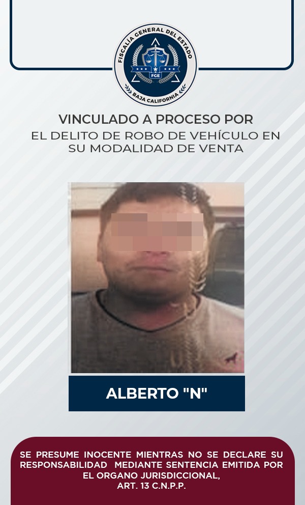 PLAYAS DE ROSARITO, B.C. Pruebas reunidas por el Ministerio Público, permitieron a la Fiscalía Regional de Playas de Rosarito, lograr la vinculación a proceso de Alberto “N”, por el delito de robo equiparado de vehículo de motor en su modalidad de venta.
