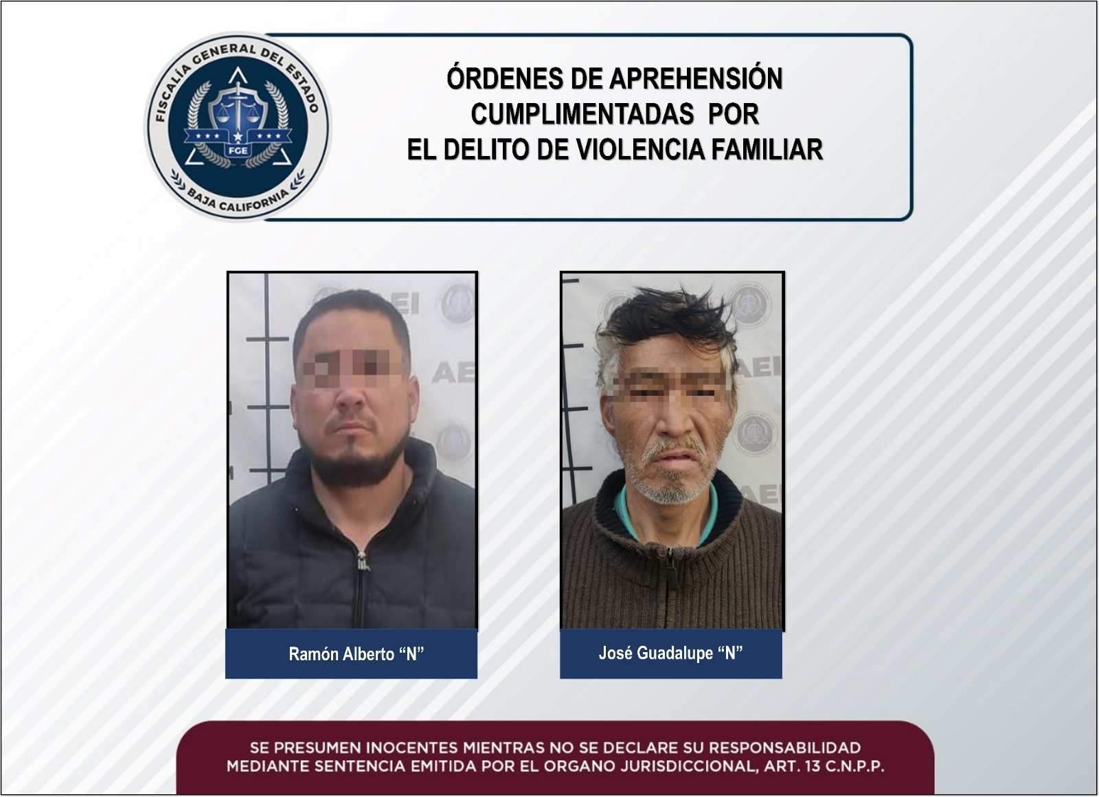 MEXICALI, B.C. Cumpliendo con el compromiso de proteger a los ciudadanos que se encuentran en riesgo de sufrir algún tipo de agresión física y psicológica, así como aplicar el peso de la ley a quienes han cometido este tipo de ilícitos, la Fiscalía General del Estado, cumplimentó, durante acciones diferentes, dos órdenes de aprehensión por el delito de violencia familiar.