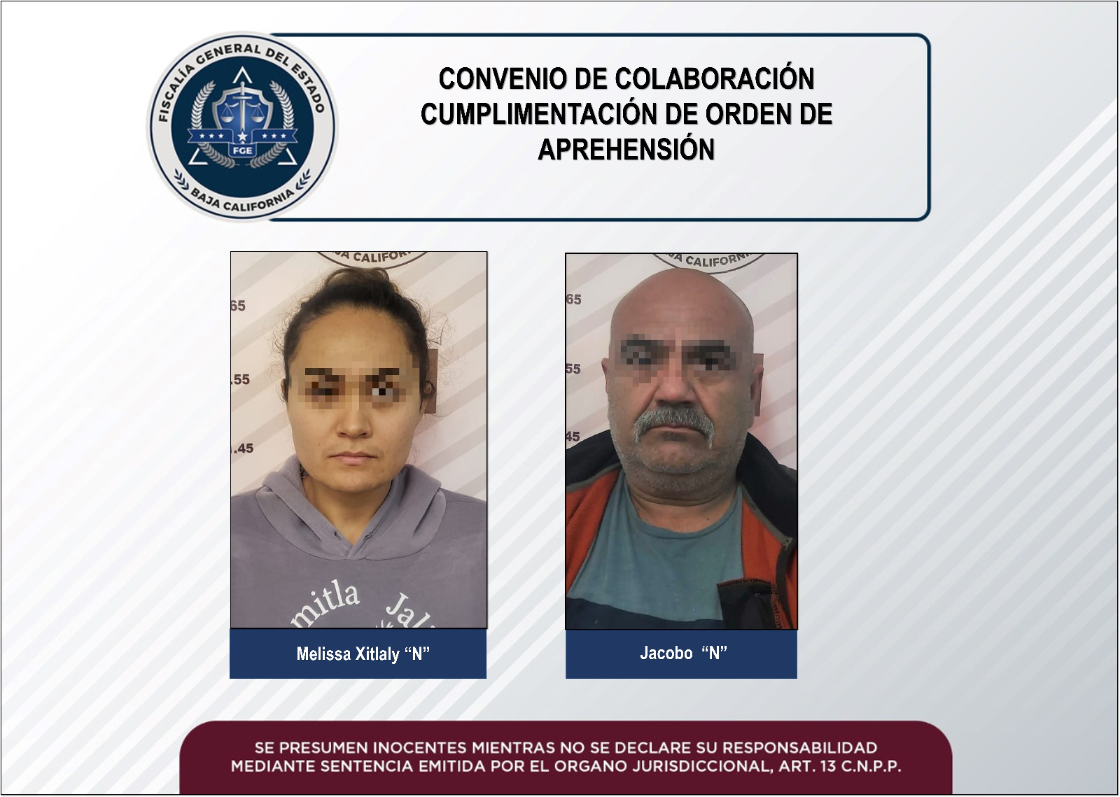 MEXICALI, B.C. Agentes de la Fiscalía General del Estado (FGE), cumplimentaron una orden de aprehensión en contra de un hombre y una mujer que eran buscados en el Estado de Sinaloa, por el delito de homicidio al haberse cometido con premeditación, ventaja y a propósito de un robo por el sujeto activo en contra de su víctima, en grado de tentativa.