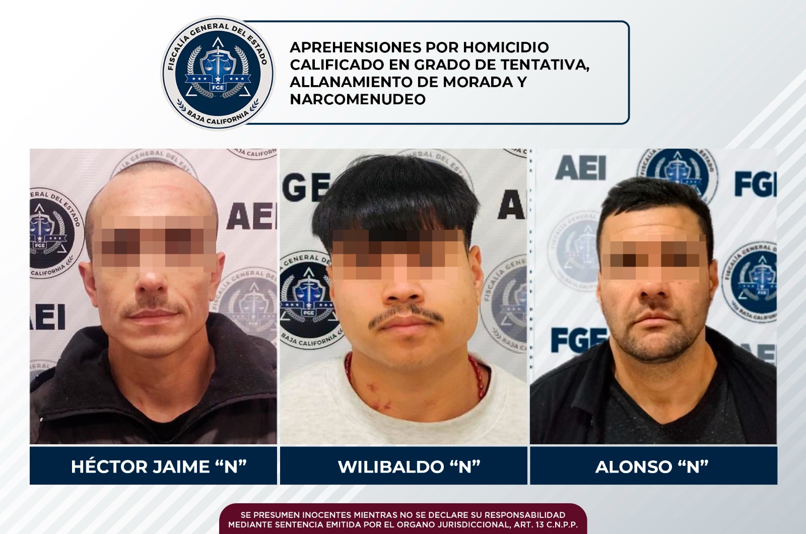 TIJUANA, B.C. La Fiscalía General del Estado, a través de los elementos de la Agencia Estatal de Investigación, logró la captura de tres prófugos de la ley, quienes contaban con orden de aprehensión por casos y delitos diversos.