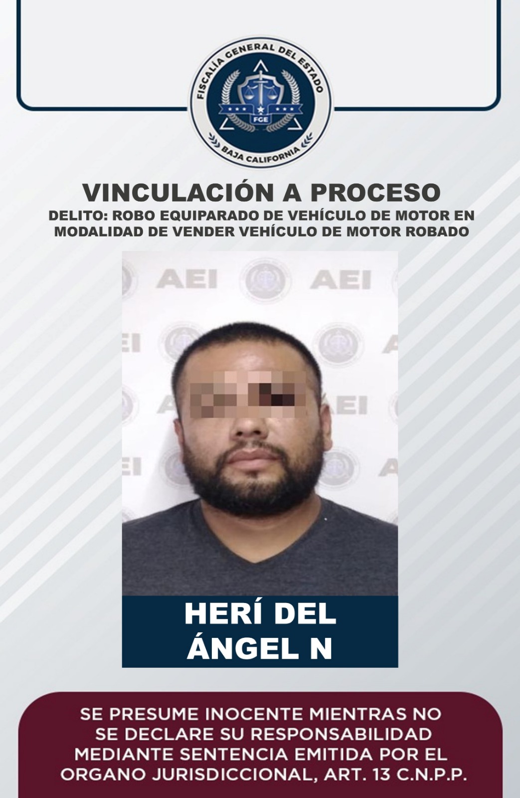 ENSENADA, B.C. Como resultado de la labor realizada por la Unidad de Investigación de Robo de Vehículos, de la Fiscalía Regional de Ensenada, se logró la vinculación a proceso de Herí del Ángel “N”, a quien se le atribuye la venta de un vehículo robado.