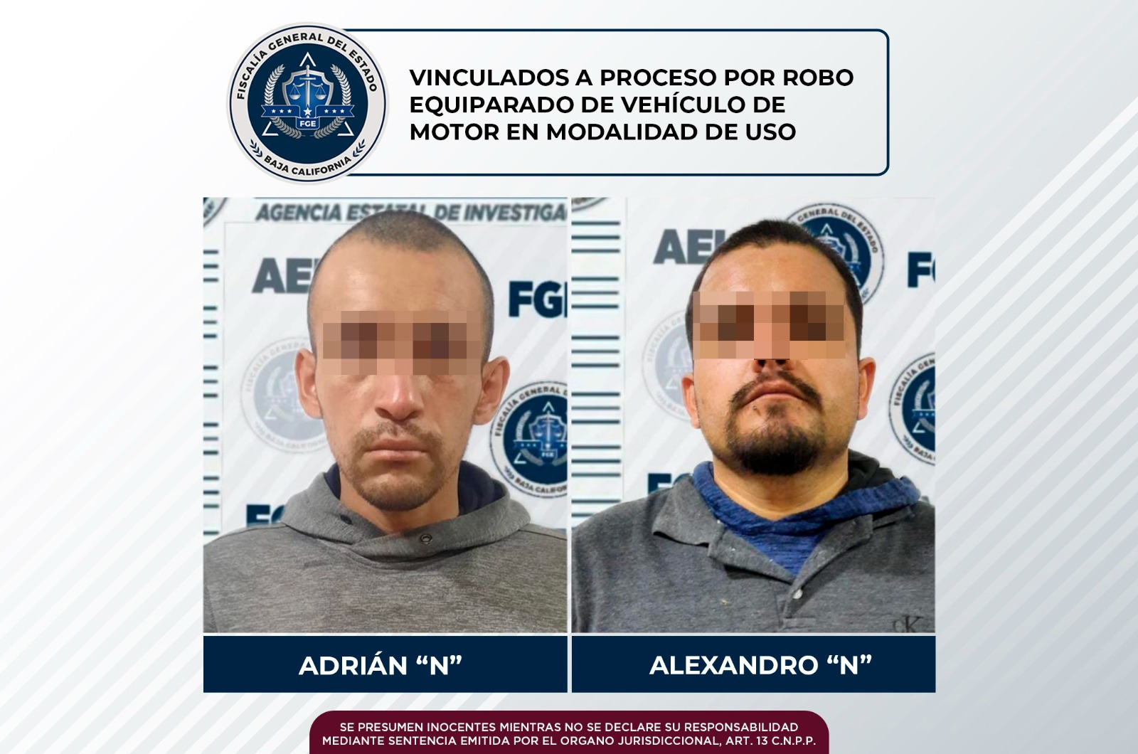 TIJUANA, B.C. Mediante datos de prueba concluyentes aportados por el Ministerio Público ante un Juez de Control, la Fiscalía Regional de Tijuana logró la vinculación a proceso de dos sujetos acusados del ilícito de robo equiparado de vehículo de motor en la modalidad de uso.