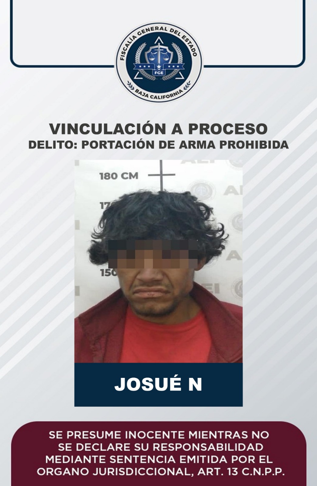 ENSENADA, B.C. Por el delito de portación de arma prohibida, la Fiscalía Regional de Ensenada obtuvo la vinculación a proceso de Josué “N”, mismo a quien se le impuso medida cautelar de prisión preventiva justificada.