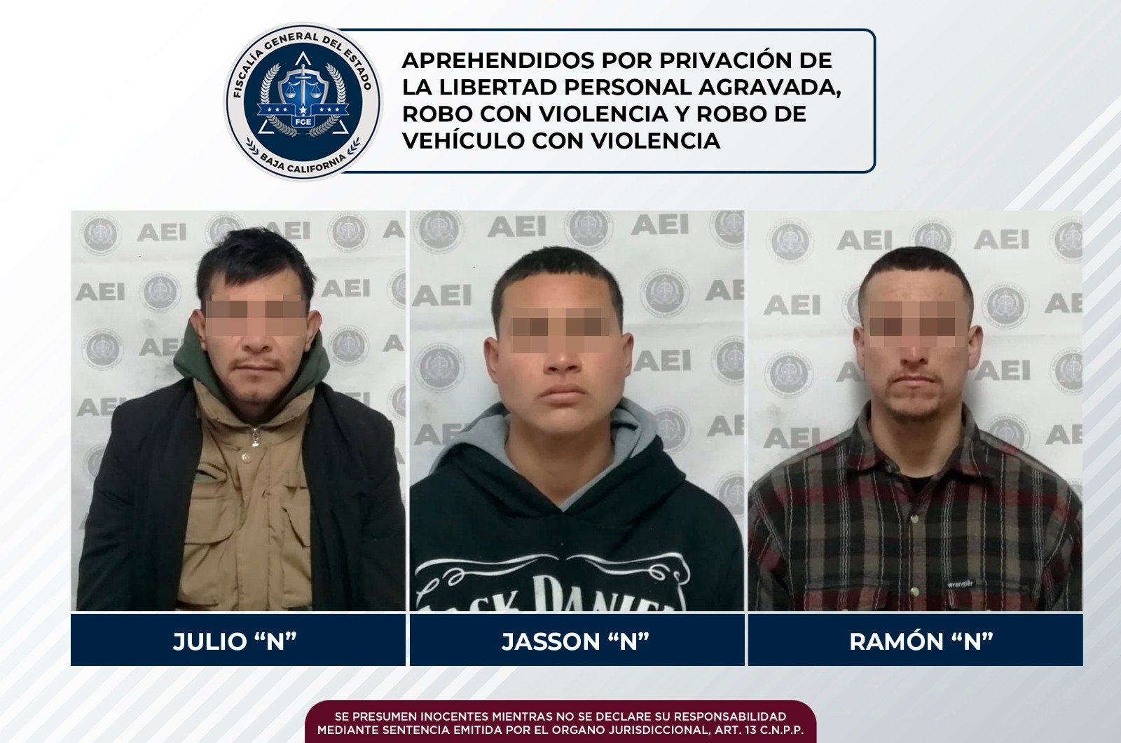TECATE, B.C. Labores de investigación efectuadas por elementos de la Agencia Estatal de Investigación (AEI) de la Fiscalía General del Estado, derivaron en la captura de tres hombres que contaban con orden de aprehensión por los delitos de privación de la libertad personal agravada, robo con violencia y robo de vehículo con violencia.