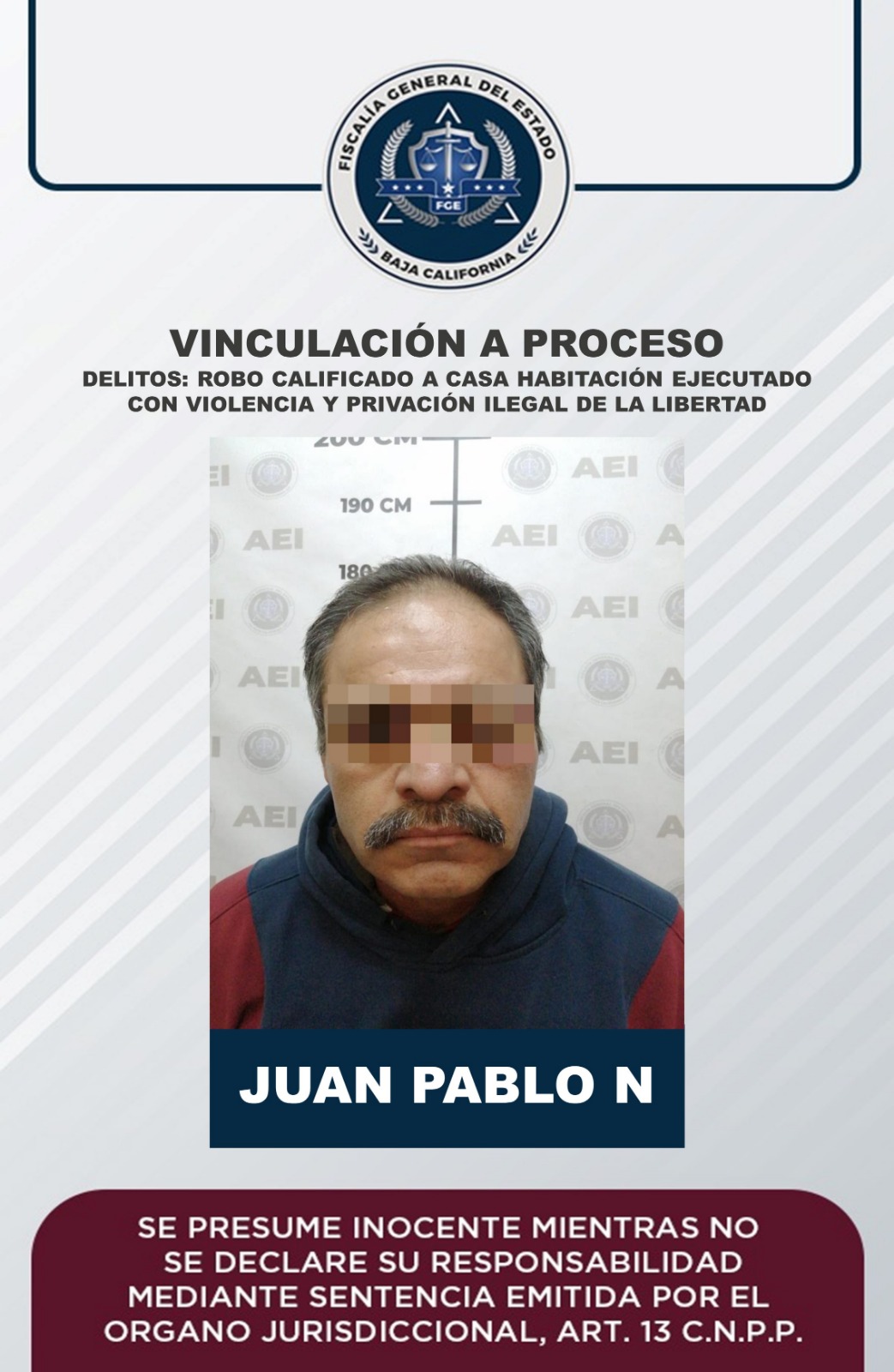 ENSENADA, B.C. La Fiscalía Regional de Ensenada logró la vinculación a proceso de Juan Pablo “N”, por los delitos de robo calificado a casa habitación ejecutado con violencia y privación ilegal de la libertad, ilícitos cometidos en perjuicio de un sexagenario el 29 de enero del año en curso.