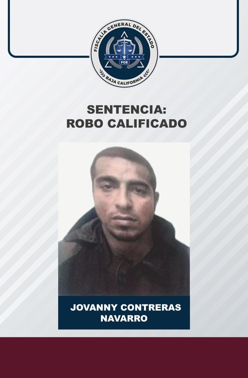 ENSENADA, B.C. La Fiscalía Regional de Ensenada logró una sentencia condenatoria en contra de Jovanny Contreras Navarro, quien es penalmente responsable del delito de robo calificado cuando se cometa a establecimiento comercial con servicio al público.