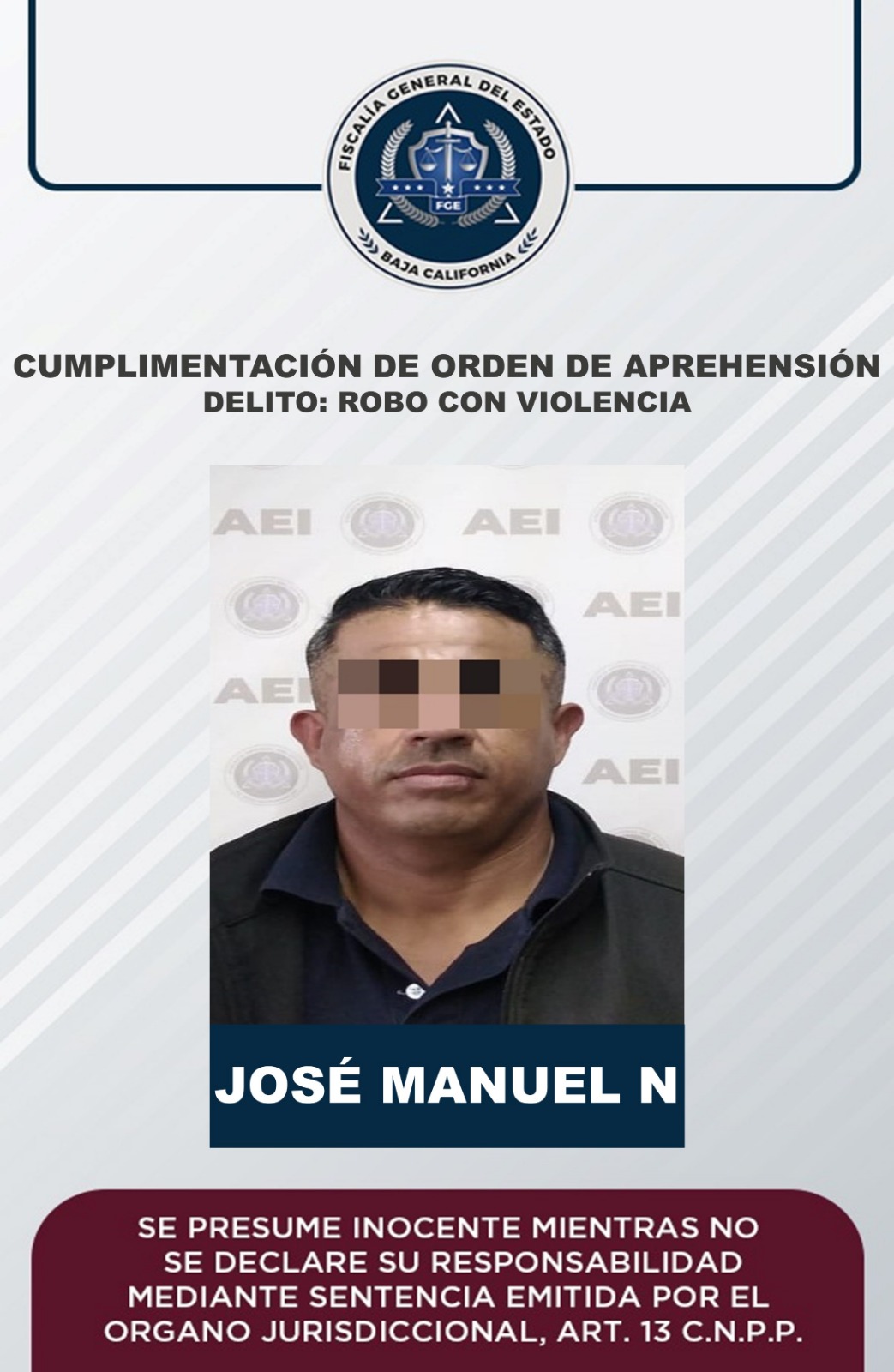 ENSENADA, B.C. La Fiscalía General del Estado (FGE), en Ensenada, cumplimentó una orden de aprehensión contra José Manuel “N” por el delito de robo con violencia.
