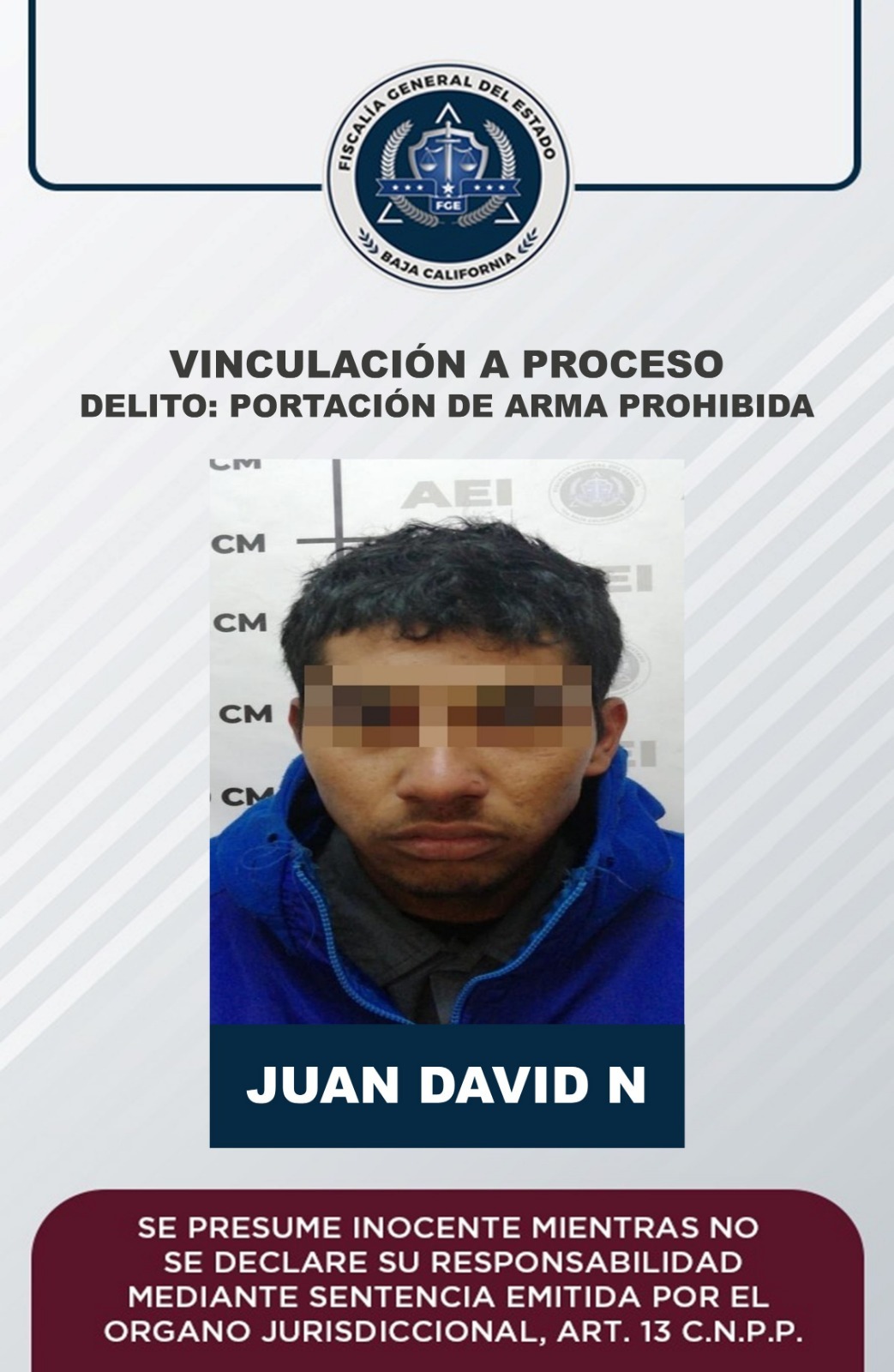 ENSENADA, B.C. Por el delito de portación de arma prohibida quedó vinculado a proceso y en prisión preventiva, Juan David “N”, quien fue detenido en días pasados por la Policía Municipal en el fraccionamiento Bahía, informó la Fiscalía Regional de Ensenada.