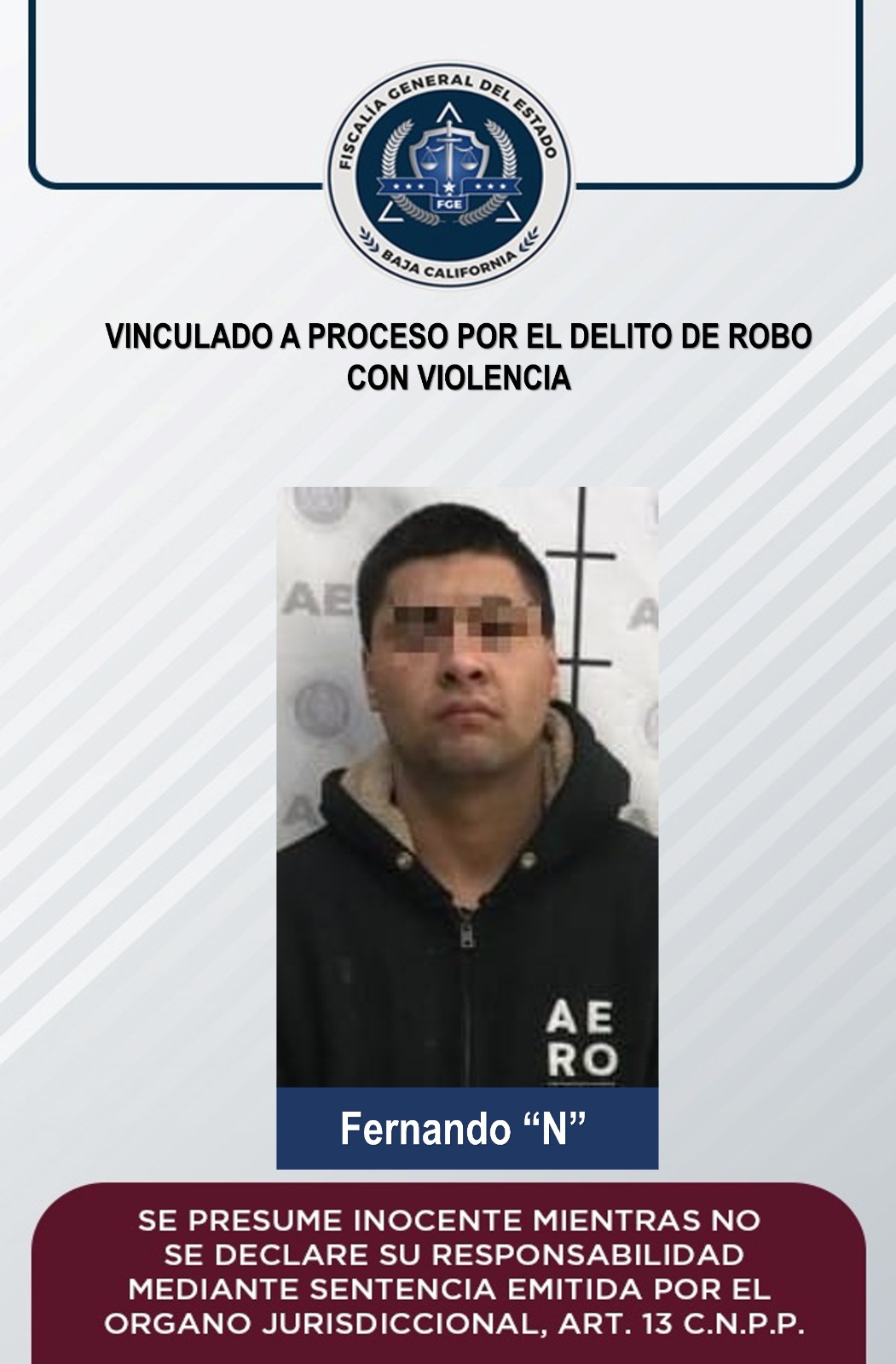 MEXICALI, B.C. La Fiscalía Regional de Mexicali a través de la Unidad de Investigación con Detenidos Poniente obtuvo la vinculación a proceso de Fernando “N”, por el delito de robo con violencia.