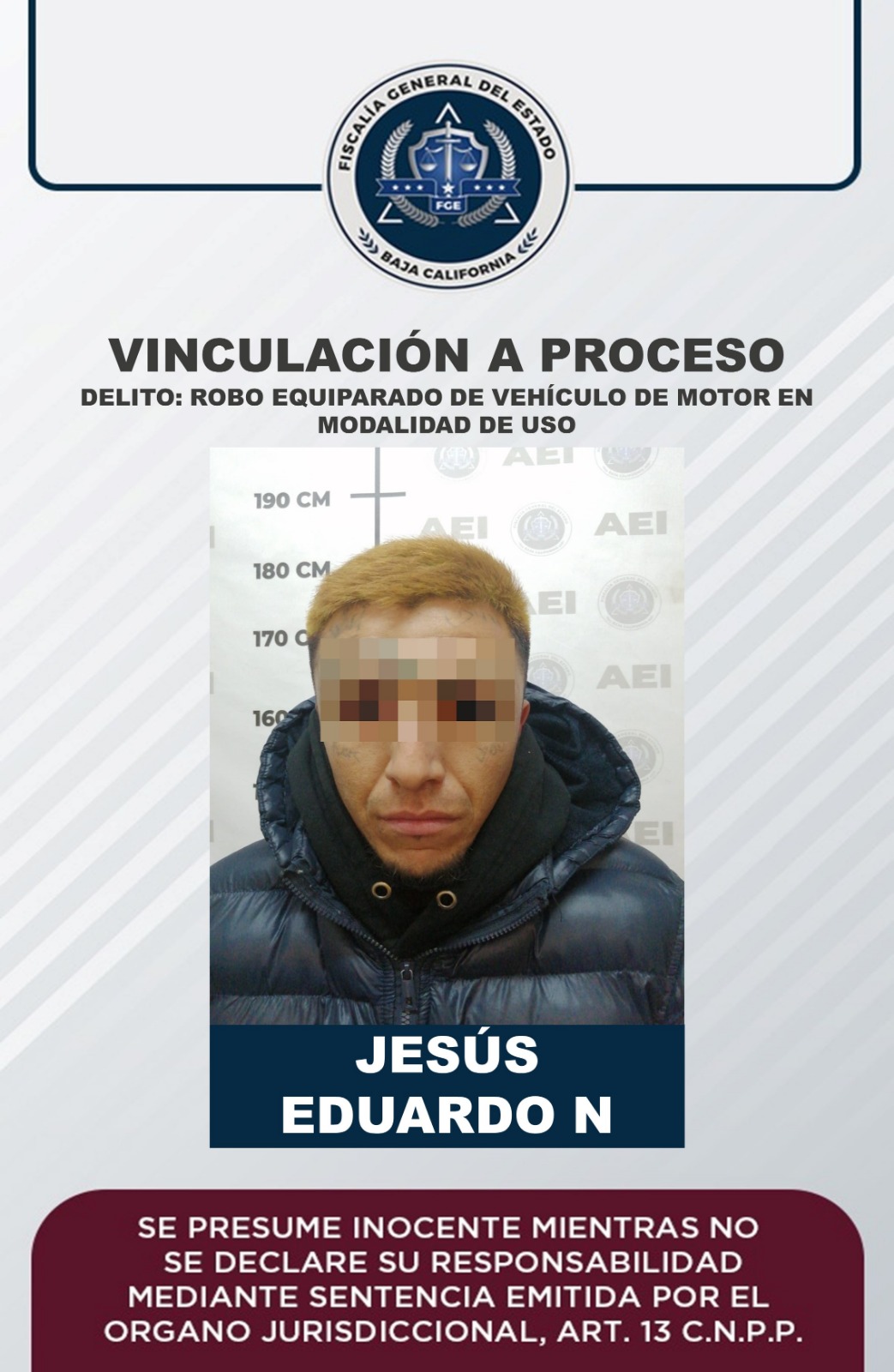 ENSENADA, B.C. La Fiscalía Regional de Ensenada obtuvo la vinculación a proceso de Jesús Eduardo “N”, por el delito de robo equiparado de vehículo de motor en modalidad de uso.