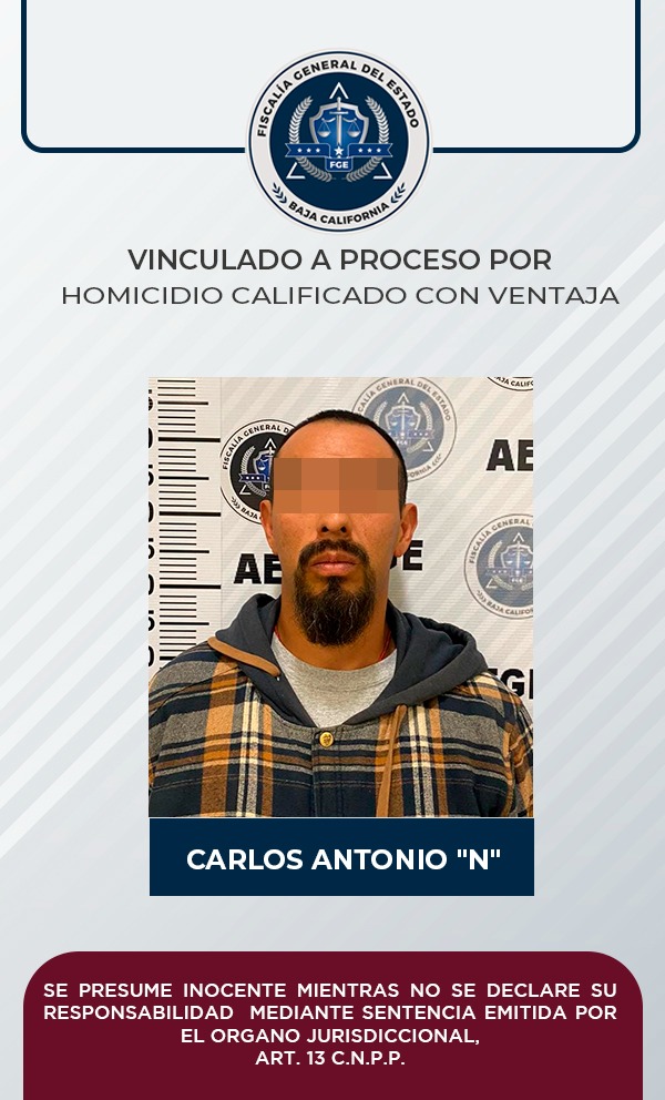 TIJUANA, B.C., Como resultado de diversas acciones de investigación y datos de prueba recabados y presentados por la Fiscalía General del Estado ante un Juez de Control, se vinculó a proceso a Carlos Antonio “N”, alias “El Shanoke”, por la probable comisión del delito de homicidio calificado con ventaja en agravio de quien en vida llevara el nombre de Gamaliel.
