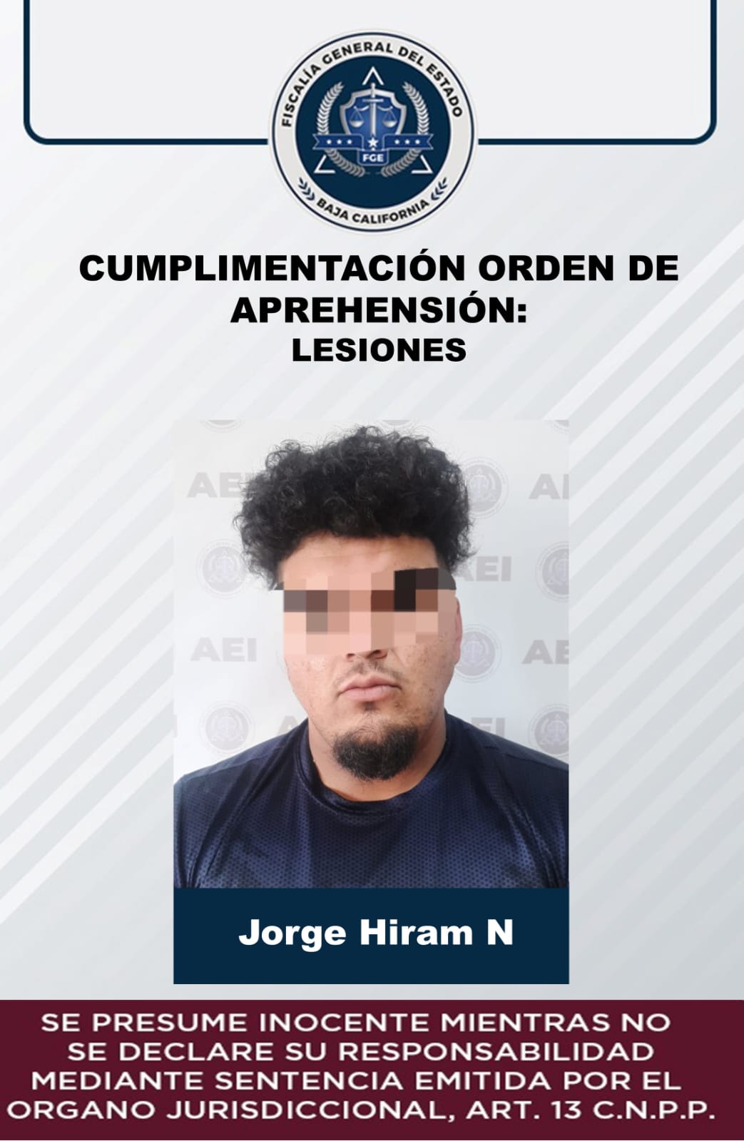 Tras contar con el mandato judicial emitido por el Juez de Control, el 7 de febrero de 2023, elementos de la Agencia Estatal de Investigación capturaron a Jorge Hiram “N”, de 22 años de edad, en el fraccionamiento Bahía.
