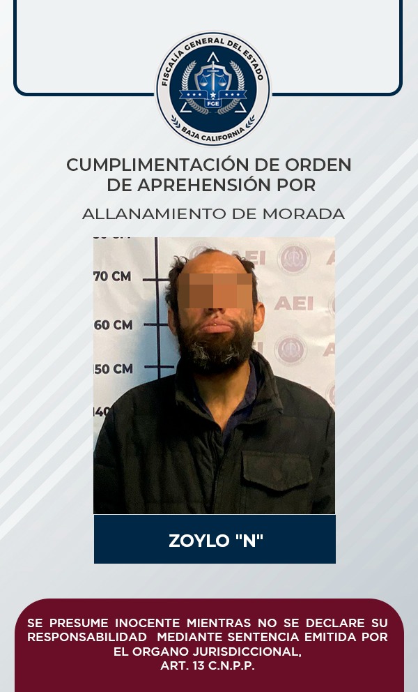 PLAYAS DE ROSARITO, B.C. Por el delito de allanamiento de morada, un sujeto que responde al nombre de Zoylo “N”, fue aprehendido por elementos de la Agencia Estatal de Investigación de la Fiscalía General del Estado.
