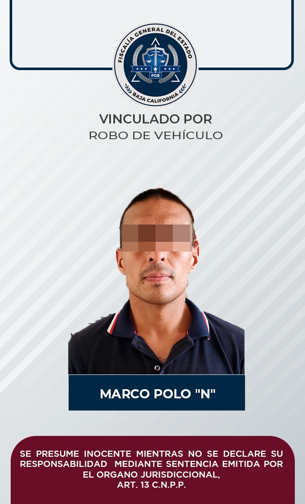MEXICALI, B.C. La Fiscalía Regional de Mexicali a través de las Unidad de Investigación de Robo de Vehículos, obtuvo a través de los elementos de prueba presentados ante el Juez, la vinculación a proceso de un acusado por el delito de robo equiparado de vehículo, en su modalidad de posesión.