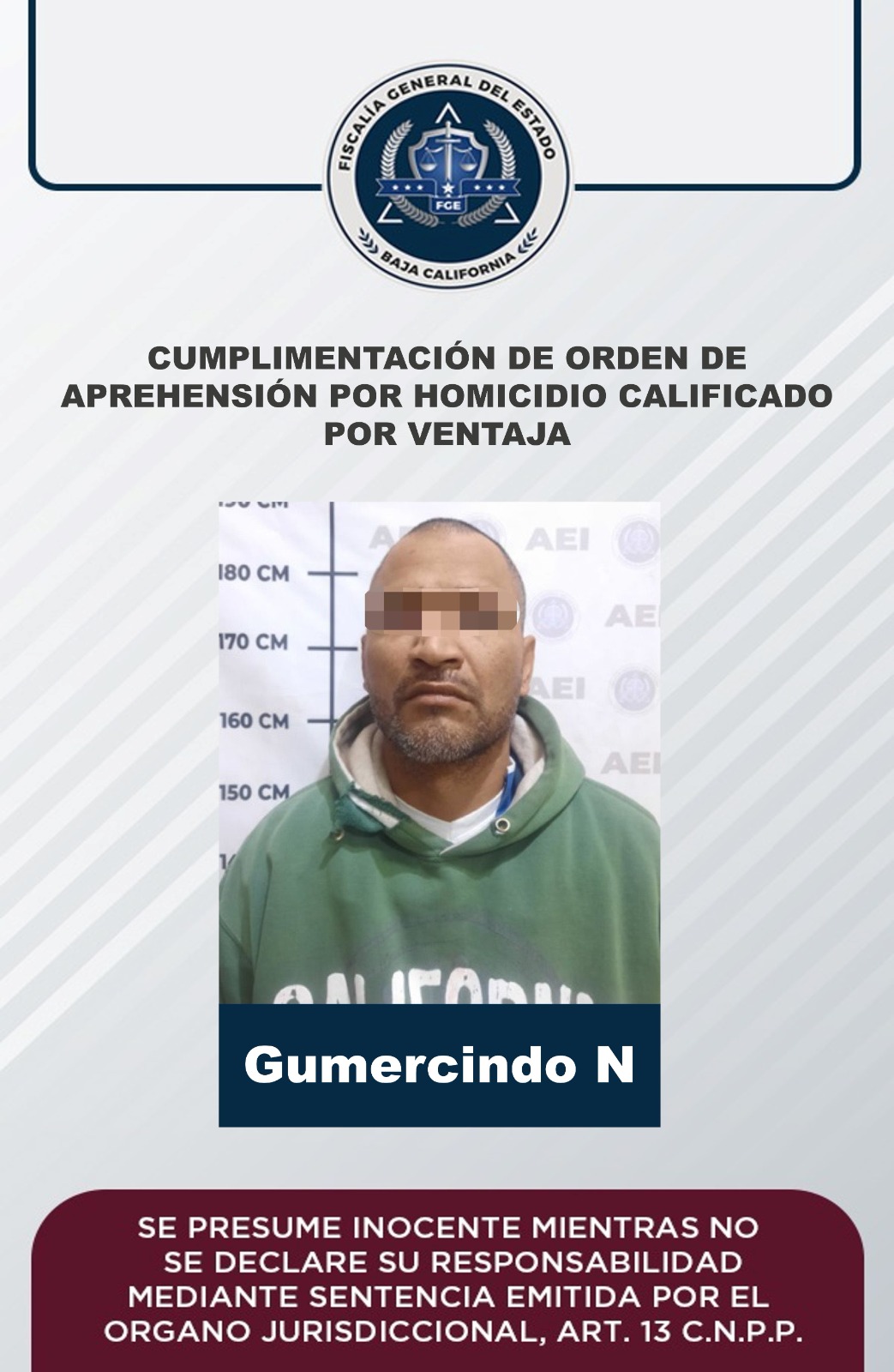 MEXICALI, B.C. A través del trabajo realizado por la Fiscalía Especializada en Delitos contra la Vida y el Grupo Especializado en Aprehensiones de la Fiscalía General del Estado, se cumplimentó un mandato judicial en contra de Gumercindo “N”, por el delito de homicidio calificado por ventaja. Según lo establecido en la carpeta de investigación, el día 11 de diciembre de 2022, el imputado llegó al domicilio ubicado en la colonia Corregidora de esta ciudad, en donde se encontraba la víctima.