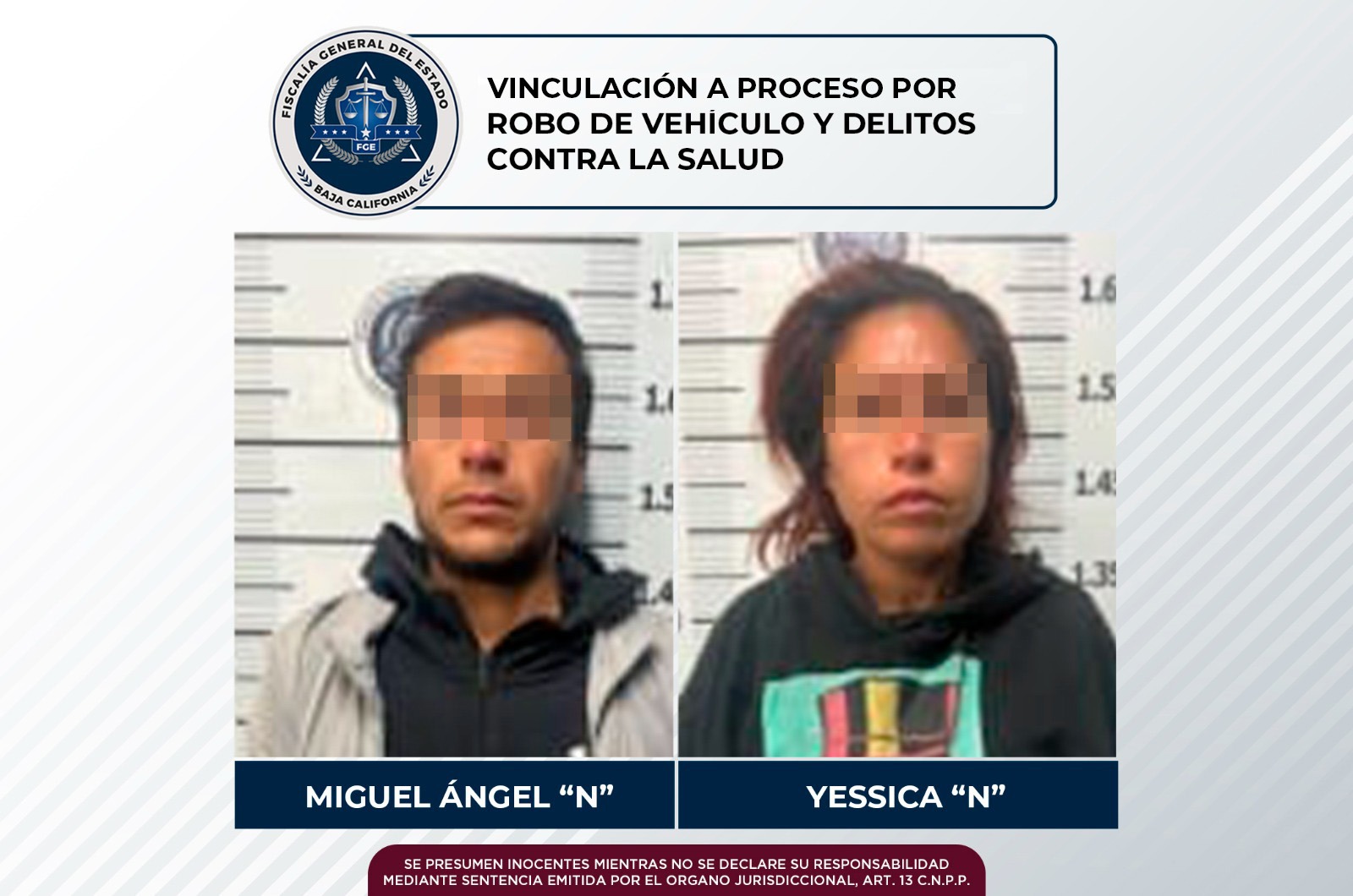 PLAYAS DE ROSARITO, B.C. Investigación efectuada por la Fiscalía Regional de Playas de Rosarito, dio como resultado la vinculación a proceso de Miguel Ángel “N” y Yessica Judith “N”, por robo equiparado de vehículo de motor (poseer vehículo de motor robado) y delitos contra la salud en su modalidad de narcomenudeo, respectivamente.